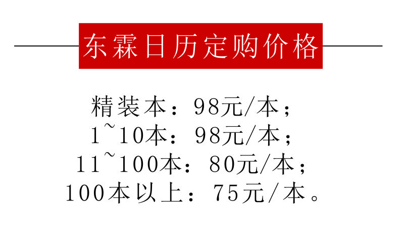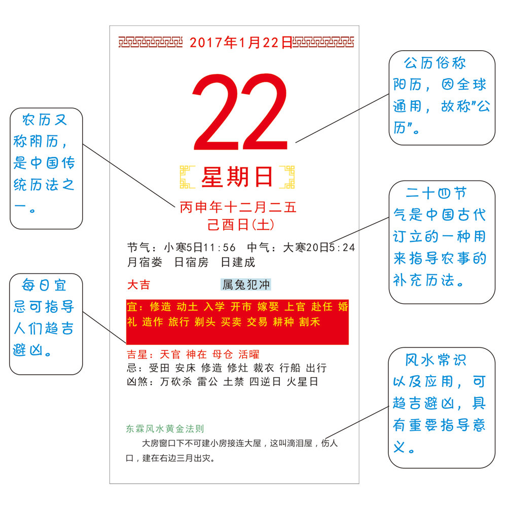 《东霖日历》,一种可以当做台历使用的日历,特殊的精装烫金打开式设计,可以放在办公桌上,方便随时打开翻阅,不仅高端大气上档次,而且为你每天的生活和工作提供趋吉避凶的指导,让你可以时刻把握天时地利与人和的脉搏,使你在如此变化莫测、节奏快速的现代生活中从容的面对一切挑战,运筹帷幄、决胜千里!