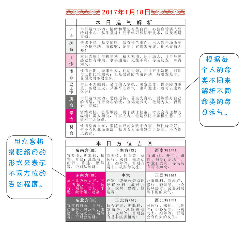 《奇门遁甲每日运程》是突出个性化的运程和吉凶,而《每日通胜》突出的是普遍性的吉凶禁忌,《东霖日历》就是把两者完全结合起来运用,使两者相得益彰、互相呼应,吉凶悔吝、进退升降尽在掌握之中,这也是《东霖日历》的独到之处,是世界上到目前为止独一无二的一个创举!