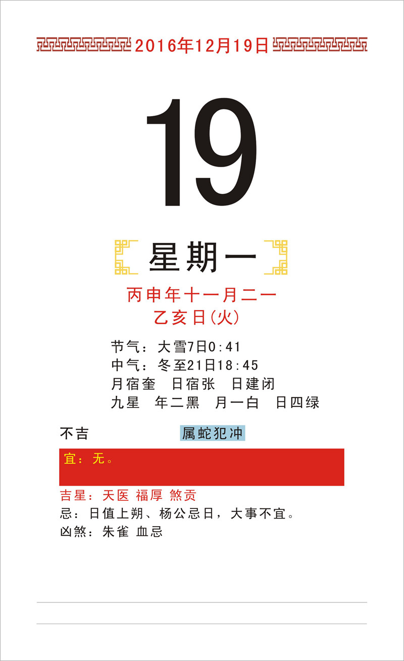 2. 每天的上半部分为“本日运气解析”下半部分为“本日方位吉凶”,用五种颜色样式来表示吉凶程度,如下所示: